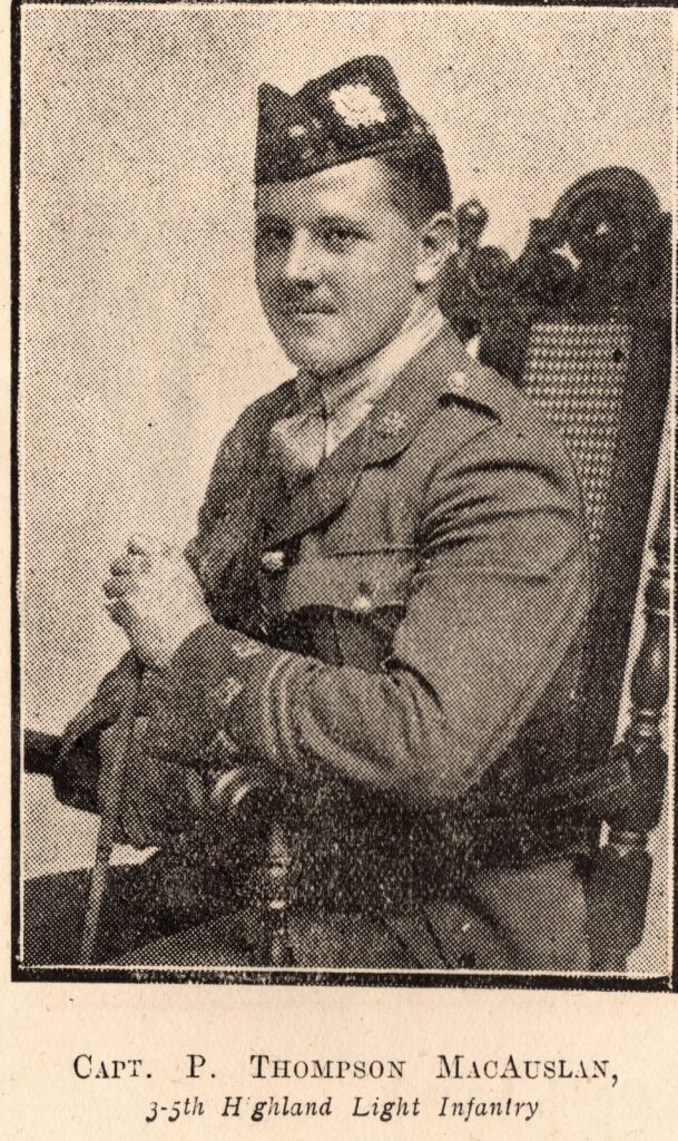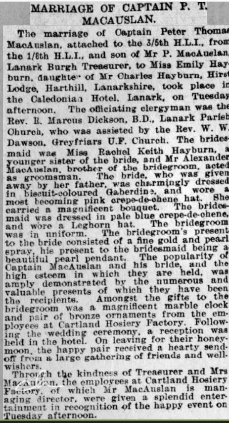 Another son of Peter MacAuslan Sr. who fought in the war was Capt Peter Thompson MacAuslan. pictured left, in the section of the booklet reserved for photographs of serving soldiers, and called the “Roll of Honour“. Three years older than his brother, William, Peter was a career soldier, enlisting in the Highland Light Infantry, rising to the rank of Captain. He was to survive the war, despite being seriously wounded by shellfire whilst leading his men in an attack on enemy positons on the Western Front. After the war, he took an axtive part in a number of events of commeration and rememberance, including being in the Guard of Honour at the cermonial opning of the Memorial Hall in Lanark in 1926. In the midst of the conflict itself, he was able to take time out to get married, an event described below in the Hamilton Advertiser, April 1916