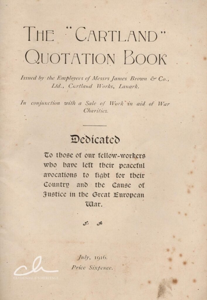 In an article on 08 July, 1916, the Carluke and Lanark Gazette urged all its readers to “Be sure and secure a copy of “The Cartland Quotation Book“. Few people today have ever heard of it, and copies of it are now very scarce, but this humble little 62 page booklet, published in 1916, is a wonderful example of how a local community sought to raise funds and boost morale during the dark days of 1916, when the Great War was not going at all well for Britain. It comprises short quotes sent in by Lanarkians, and those from surrounding towns and villages, as well as photographs of local scenes and of individuals who went off to fight. It was issued by the workforce of James Brown & Co, Cartland Works, Lanark, who were manufacturers of High Class Hosiery products