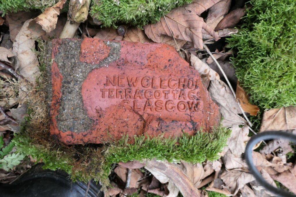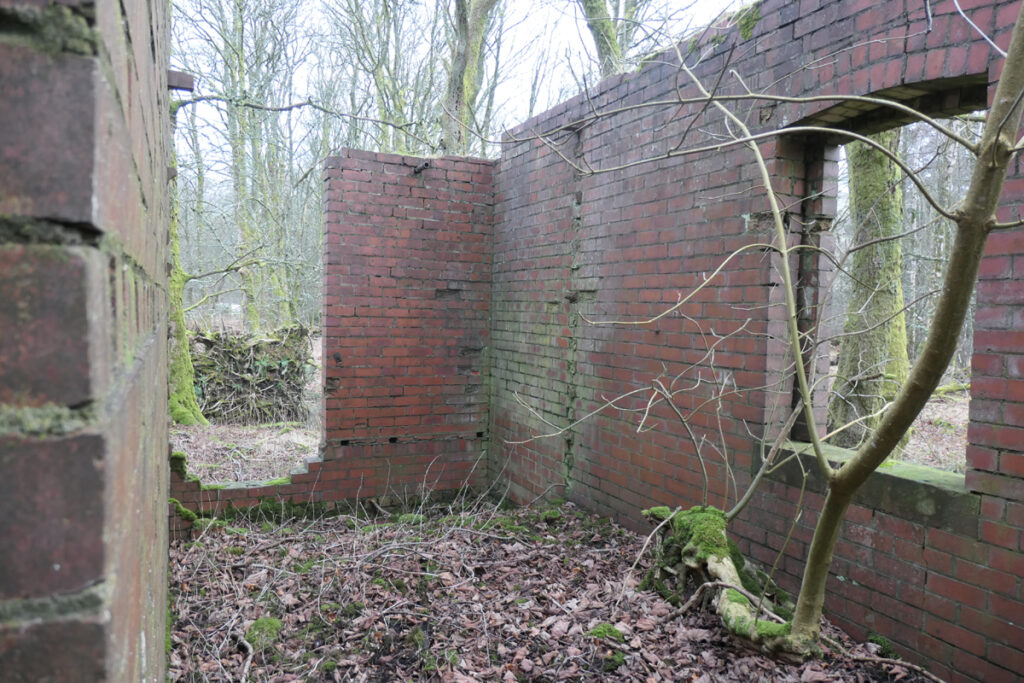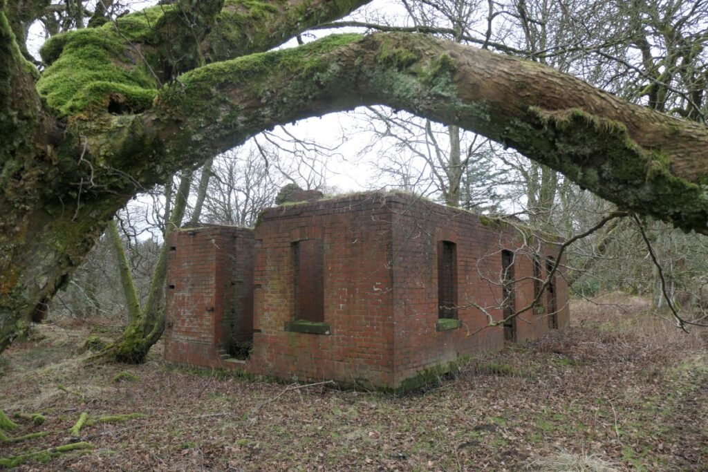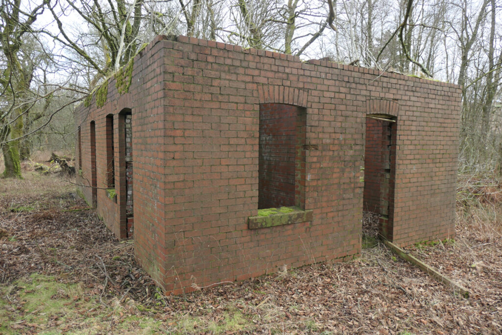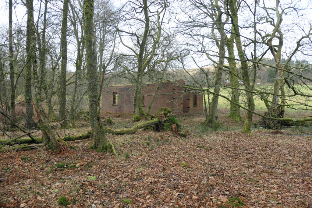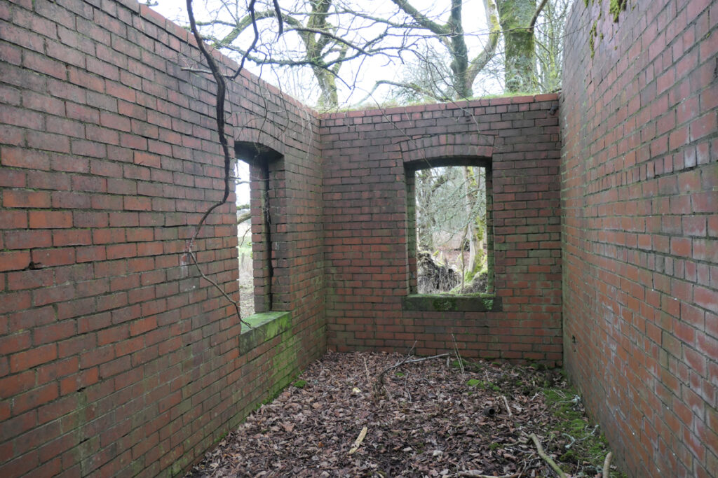 The ruins of a substantial brick building survives on the edge of Glengonnar wood on the north side of the burn and located at suitable distance from the country house to be out of sight and out of earshot. It is some distance from a road, but a kink in the fence line suggested that fuel and other supplies might have been brought across the adjoining field. The plain structure is constructed from robust Cleghorn terracotta bricks. The building has a stout brick dividing wall, presumably separating the engine, generator and switchgear from the space filled with long banks of batteries. Although no trace of the roof remains, it might be imagined that the space above the battery area would have been well ventilated with a louvres