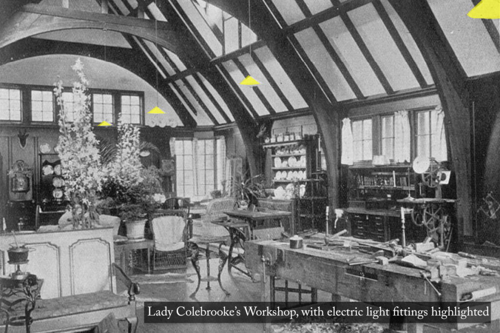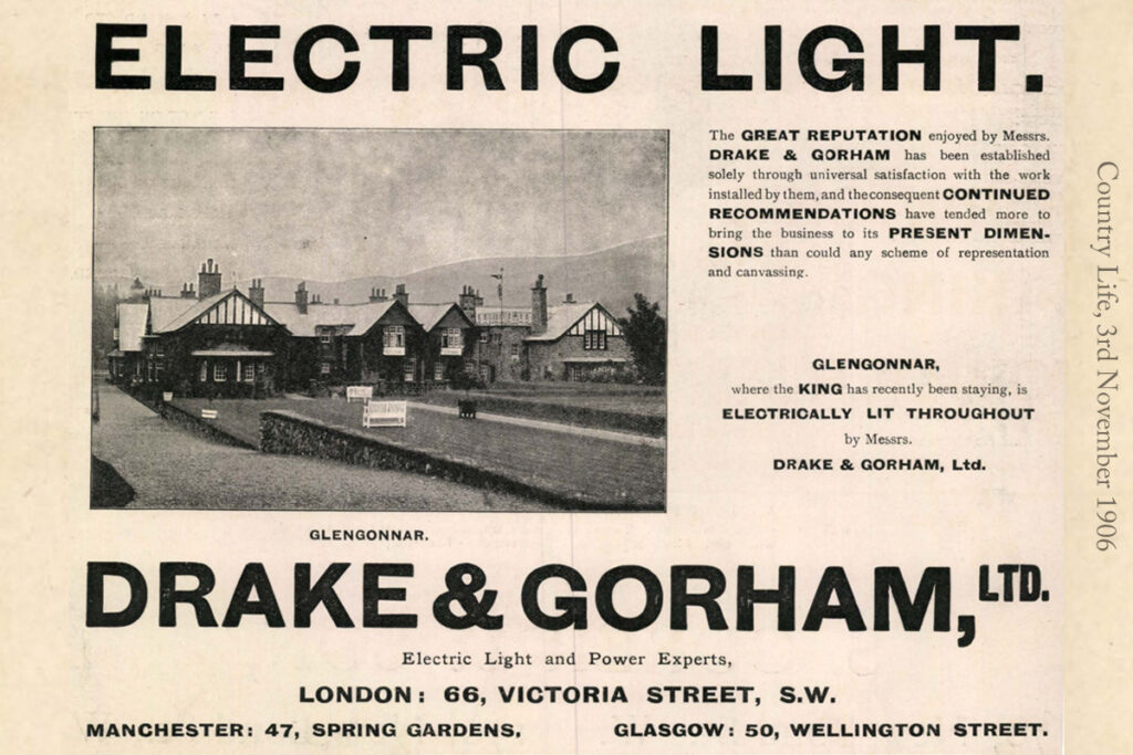 Installation of simple electrical lighting and generating plant became a practical, if costly, possibility by the early-1890’s, but was still a novelty in 1900 when Sir Edward and Lady Colebrooke chose to install electric lighting in the extravagant new country house they were building at Glengonnar near Abington. The electrical work was overseen and installed by the firm of Drake & Gorham who specialised in county house systems and had a base in Glasgow. The company installed electric lighting to Buckingham Palace soon after the death of Queen Victoria, (who had a distrust of electricity.)