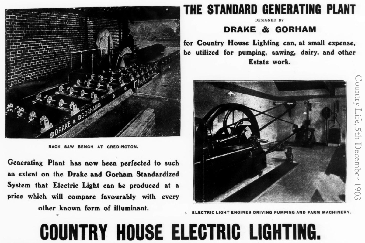 “While electric light has for some years been without rival in respect to its cleanliness, convenience and safety from fire risk, it has suffered from one important drawback which has limited its adoption in country houses – the necessity of a supply of electricity to the premises”. A special supplement to Country Life magazine went on to advise the owners of grand estates how they might install generating plants to bring the latest comforts of modern life to their country house.