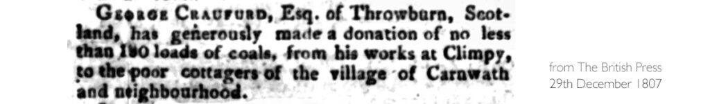 For a while, the Climpy estate was a busy hive of industry supporting a large population. One of the assets of the estate was stated as “the abundant supply of dung from the populous village of the estate,….very valuable in an agricultural point of view”. However the early optimism soon dissolved in the economic turmoil brought about by the Napoleonic wars. In 1811, George Crawford was declared bankrupt, and in the following year production was also halted at Wilsontown iron works. Hundreds lost their livelihood, some their savings, and much of the parish was “reduced to a state of beggary”. Houses fell vacant and derelict, and works were left to rust.