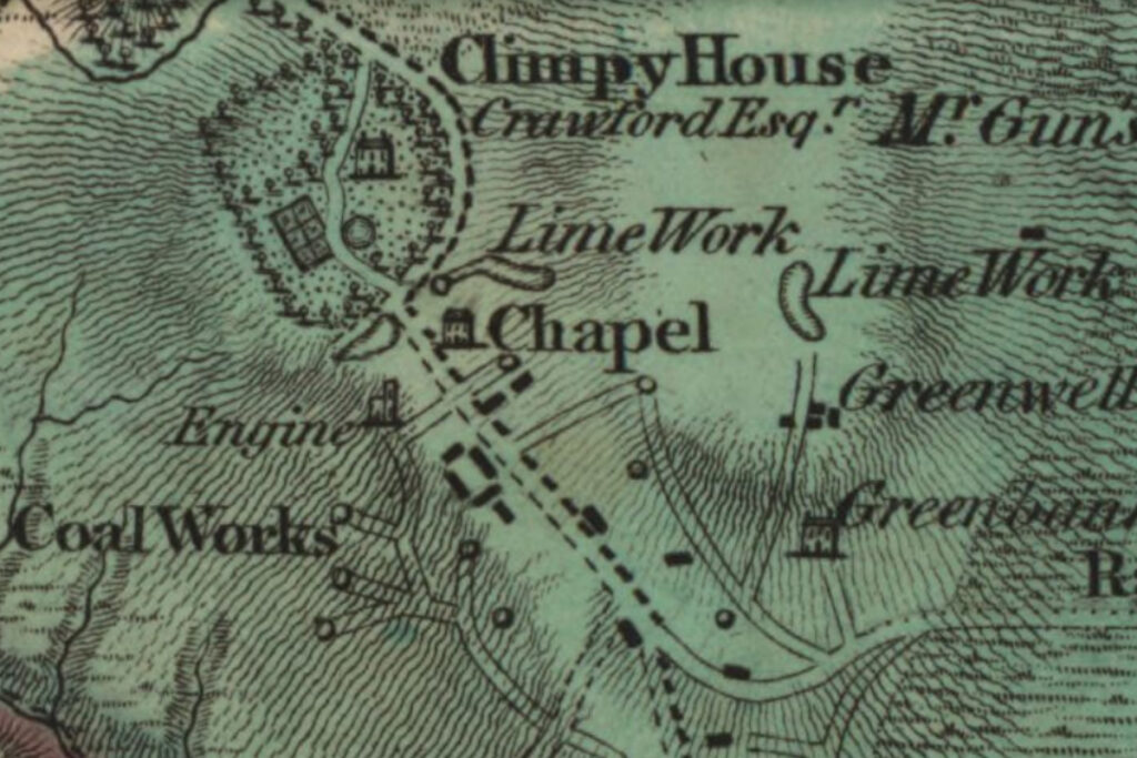 George Crawford, an Edinburgh merchant, had ambitious plans to develop his Climpy estate. In 1802 he leased the limestone beneath his lands to the newly-formed Shotts Iron Company, and arranged to work it on their behalf. He built draw-kilns to produce lime for agricultural purposes, while crushed limestone was carted the five miles to feed the furnaces of Shotts iron works. Detailed plans for a rail-road to link Climpy with the works were commissioned in 1812, but it was never built. A range of houses were constructed to accommodate the substantial workforce of the lime-,works, along with a school house and a chapel (a Relief Meeting House). The coal reserves of the estate were leased by the Wilsontown Iron Co. in 1804, who soon built further housing for 140 families, sunk pits equipped with steam engines and horse gins, and constructed tramways linking pits with the ironworks.