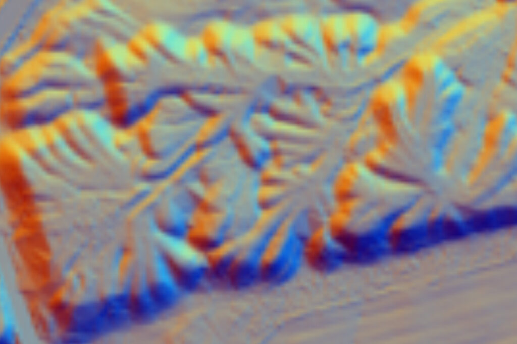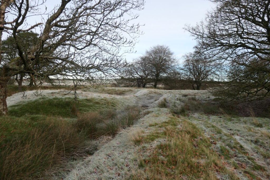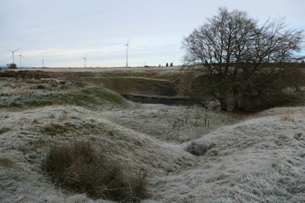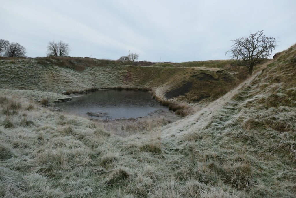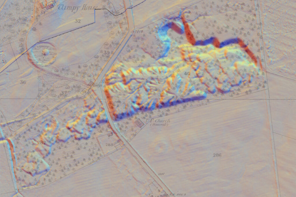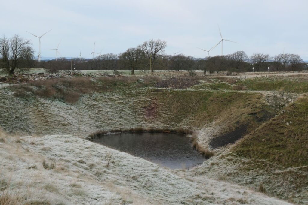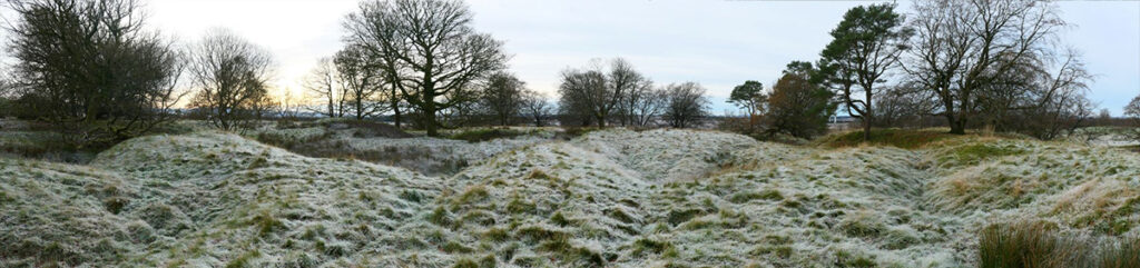 Just before leaving Climpy and heading towards Shotts, there is a kink in the road. On one side is a cottage – once the lodge for Climpy House – on the other a wooded mound that provides a rare patch of shelter. The mound is a further relic of industry. Clambering through the trees reveals a series of mounds and hollows, while further to the east a deep gash in the ground follows a snaking course where limestone once outcropped at surface. The full interest and wonder of this place can only really be appreciated when viewed from above using Lidar technology. An elegant pattern of radiating banks and promontories is then revealed, looking rather like the fingers of a hand or a bunch of berries.