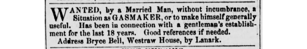 Money worries continued, and by the time of the 1851 census, the much-altered Westraw mansion served as little more than a farmhouse. Among those living at the farmsteading was Bryce Bell, described in the census as a farm labourer. In 1857 he placed an advertisement seeking employment as a Gasmaker, so presumably he had been in charge of the Westraw gas works in earlier, more optimistic, days It’s not known if he ever made gas again, but by 1861, the census records him in the happy position of being a master grocer with a shop in Biggar.