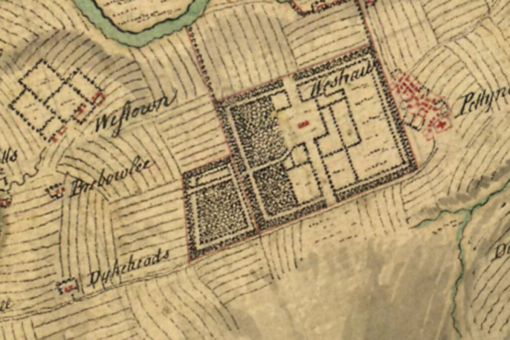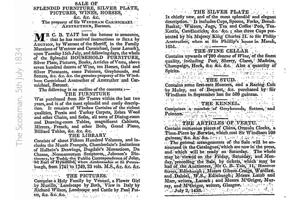 Westraw House has a long but rather cloudy history. A mansion house has stood on the site since at least the 16th century, and Roy’s map of c.1755 shows the building set within an elegant planned landscape. The Westraw estate, along with the Carmichael and part of the Mauldslie estate, became the property of Sir Wyndham Carmichael Anstruther in 1831, following a curious sequence of events, (This intriguing story may be the subject of a future post). Sir Wyndham was described at that time as “ a spendthrift….who squandered away the whole of his property.” The land was held under Entail, which meant that it could not be sold to settle debts. The grand contents of both Westraw House and Carmichael House were however seized by the sheriff’s officers and put up for auction in 1834.