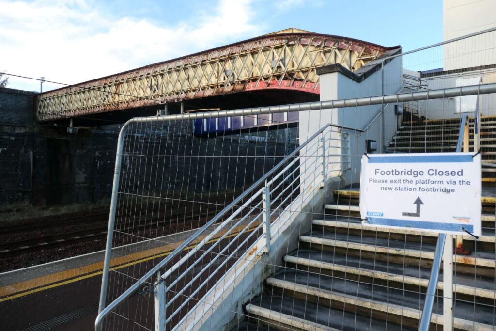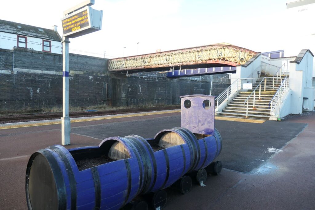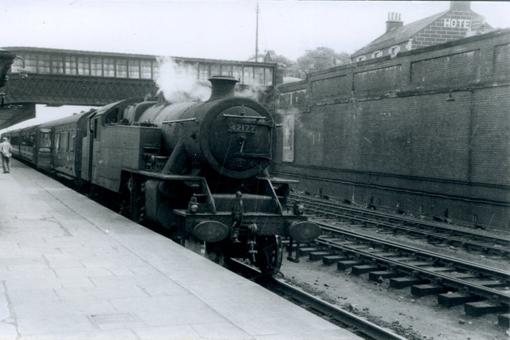 A Fairburn tank on a local service, probably in the early 60’s. Images taken in December 2024 showing the former Carstairs Junction Hotel; now “station apartments”, the original footbridge awaiting removal following installation of a new accessible entrance, and a local train waiting on the platform with the former hotel in the background.