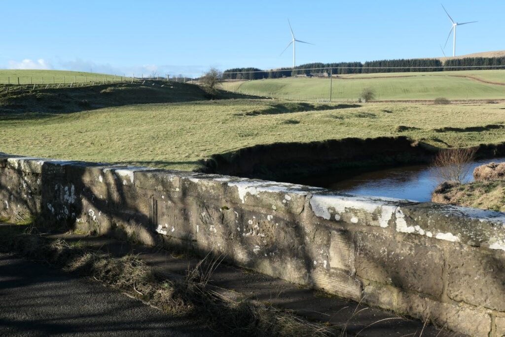 The curved embankment, looking towards the Caledonian Railway, Wolf Crookes Bridge, looking towards site of Black Douglas pit, and plaque on the bridge.