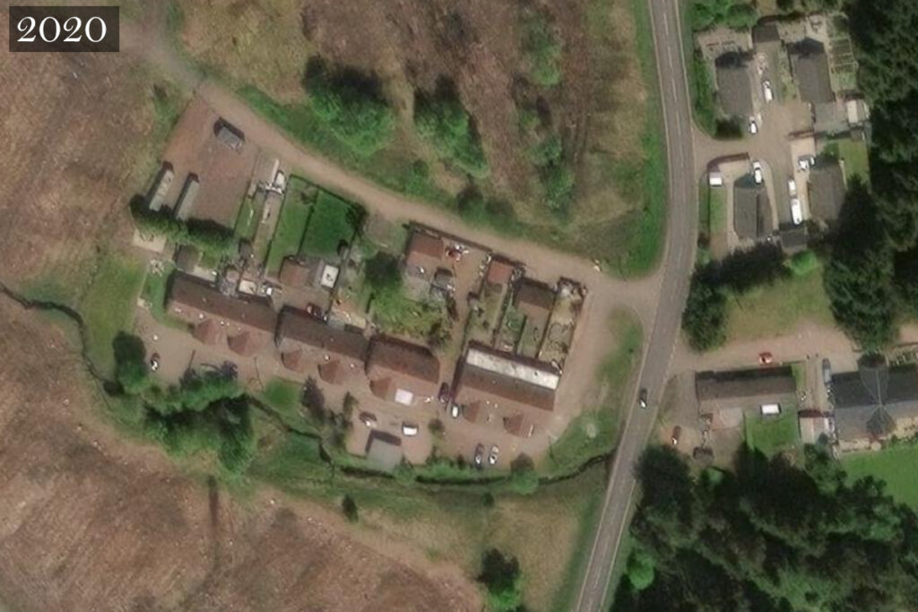 Photos of the row, taken from the south in July 2025, a mineshaft from the ironworks era has been made safe by the Coal Authority, and a bridge carrying the trackway or tramway, south of the rows